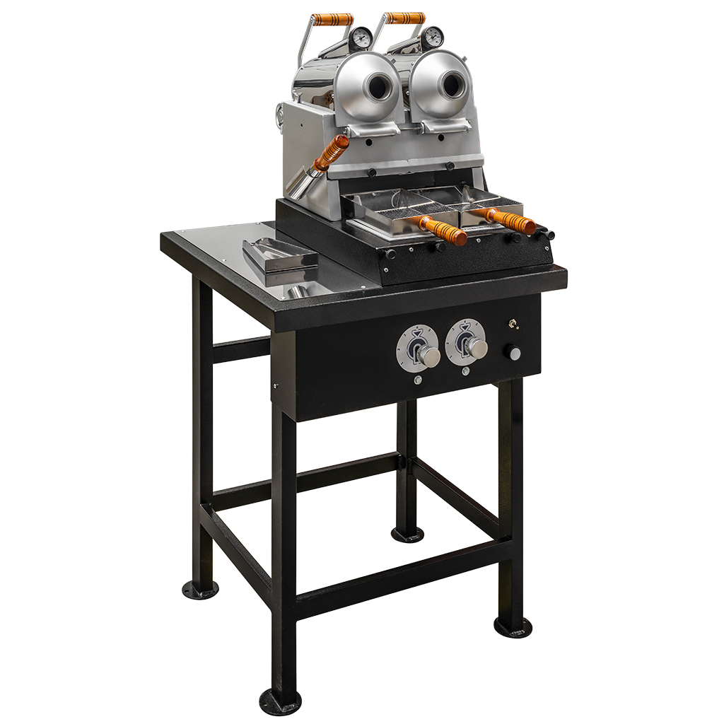 Tradicional torrador de amostras de café, disponível em modelos de 1, 2, 3 e 6 cilindros de torra, com versões opcionais com acendimento automático.